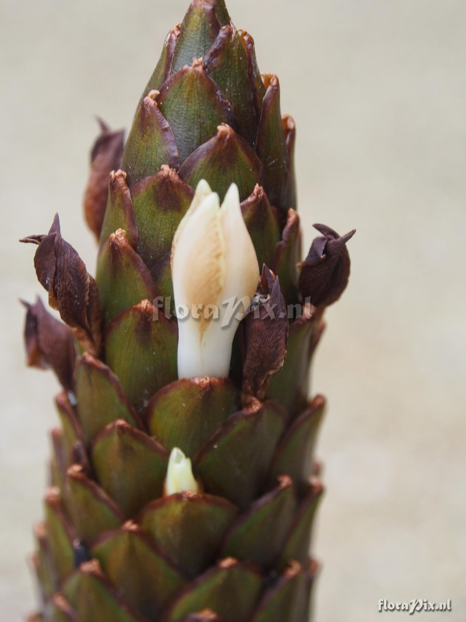 Locality: Ecuador - Unknown - I purchased this from Ecuagenera in Cuenca, Ecuador last year. They labeled it as Guzmania devansayana1, but of course it is not Guz devansayana, and unfortunately, I have no locale information. I can't identify it, can you? It is flowering now in my greenhouse in Ohio (USA). It measures 110cm high x 91cm across. The inflated portion of the inflorescence is 3.8cm wide and 13cm high. The leaves are 63cm long and 2.5cm wide (in the middle). It is a fragrant night-blooming plant and the flowers open from the top of the inflorescence downward.