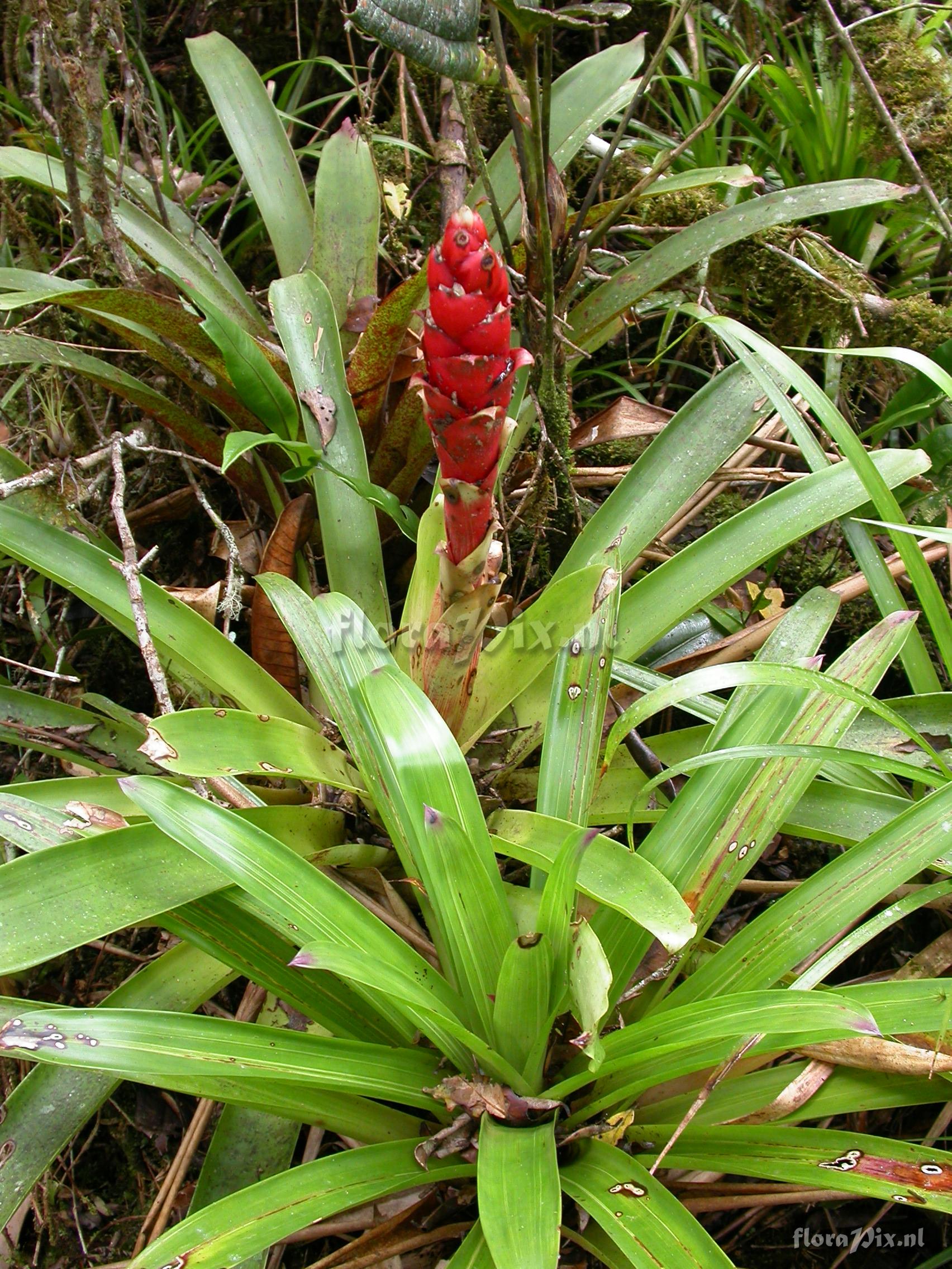 Locality: Ecuador - Province of Loja, Parque Nacional Podocarpus, Cajanuma Photographer: Florian Werner Note: (as Werner, F.A. 2024 ) "small spiky tank rosette; entire infl. bright red (no flowers present)."
