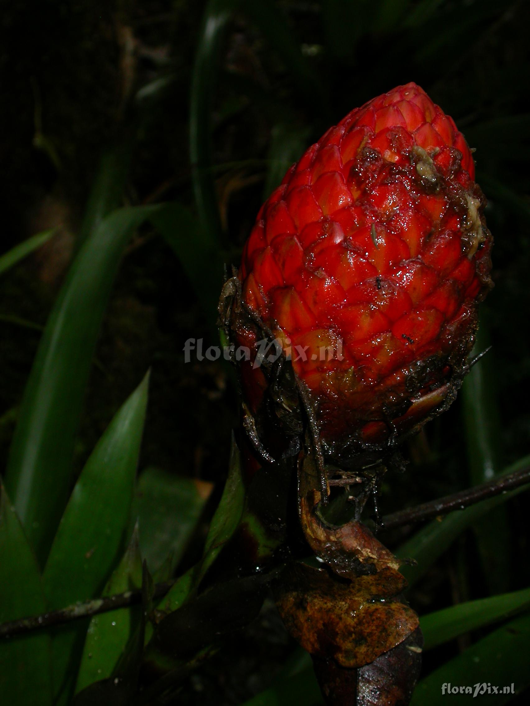 (Uploaded as: Guzmania ) Locality: Ecuador - Prov. Zamora-Chinchipe; close to Zamora; entrance of Podocarpus NP ""Bombuscaro"", tall premontane moist forest Photographer: Florian Werner Note: Col.: Werner, F.A. 3120 (08-04-2011) The bright glossy brich-red bracts forming a pine-cone-like struxcture filled with gue. Petars mild yellow. Identification: solved