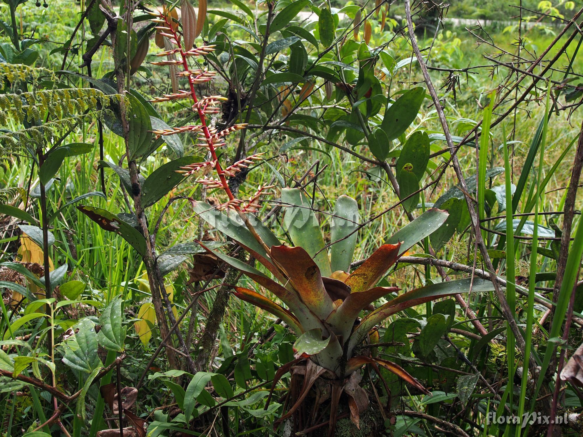 Locality: Ecuador, Zamora-Chinchipe Province - On road east from Los Encuentros toward the Condor Mnts. Common there, and in bloom (near the end of bloom) at end of January in this region. Grows epiphytically in the trees along the road. Inflorescence is bright red and yellow when in anthesis, and apparently fades fairly quickly post anthesis. Somewhat variable in size, but always with broad leaves, discolor below, and nearly yellowish green above in good light. The plant shown in anthesis had the top portion of the inflorescence broken off. Elevation between 1500 and 1600 meters in this area.