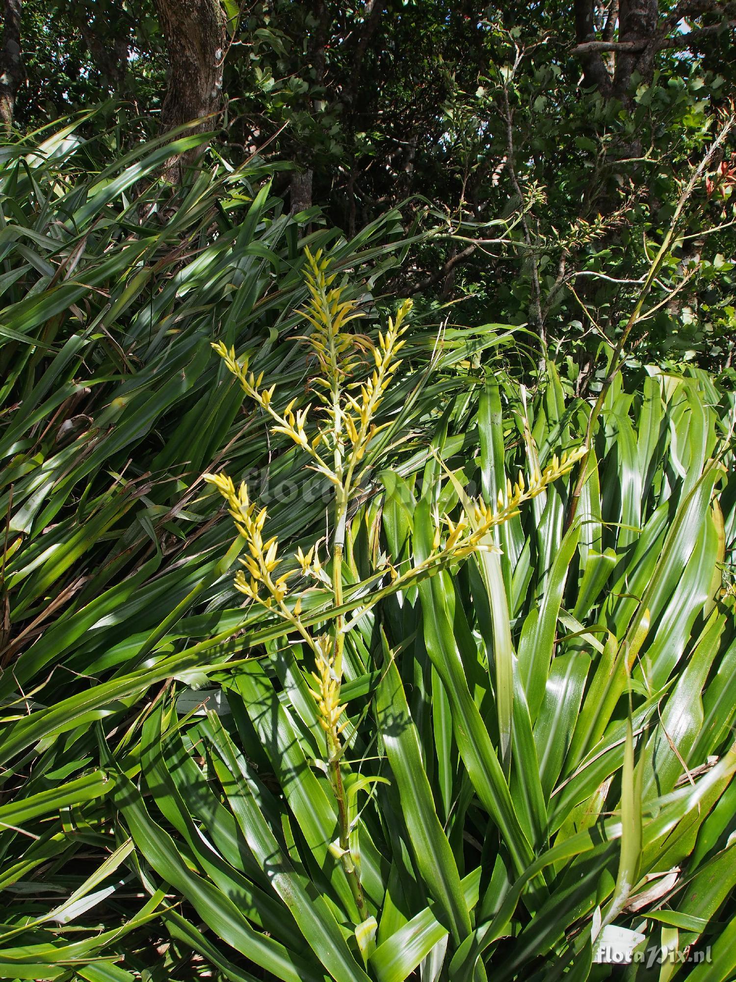 Locality: St Lucia - Top of road leading to Enbas Saut Rainforest Trail in Edmunds Forest Reserve, St Lucia at approximately 770m (2600 ft). Growing terrestrially in a great mass on the road cut. Only one specimen in bloom at the time I was there 2 Feb 2015. Wet, rainforest area and very windy where it was growing. I collected seed from plants nearby. Note that some of the pictures may show white on the flowers, but this is simply glare from off the plant in full sun. All flowers and stems were yellow in color. Plant flowering about 1.2m tall. Note: Pitcairnia angustifolia was seen growing at lower elevations on drier slopes, but it is red in color. Photographer: Jerry Raack (Sent: brom-l@science.uu.nl) Identification: asked