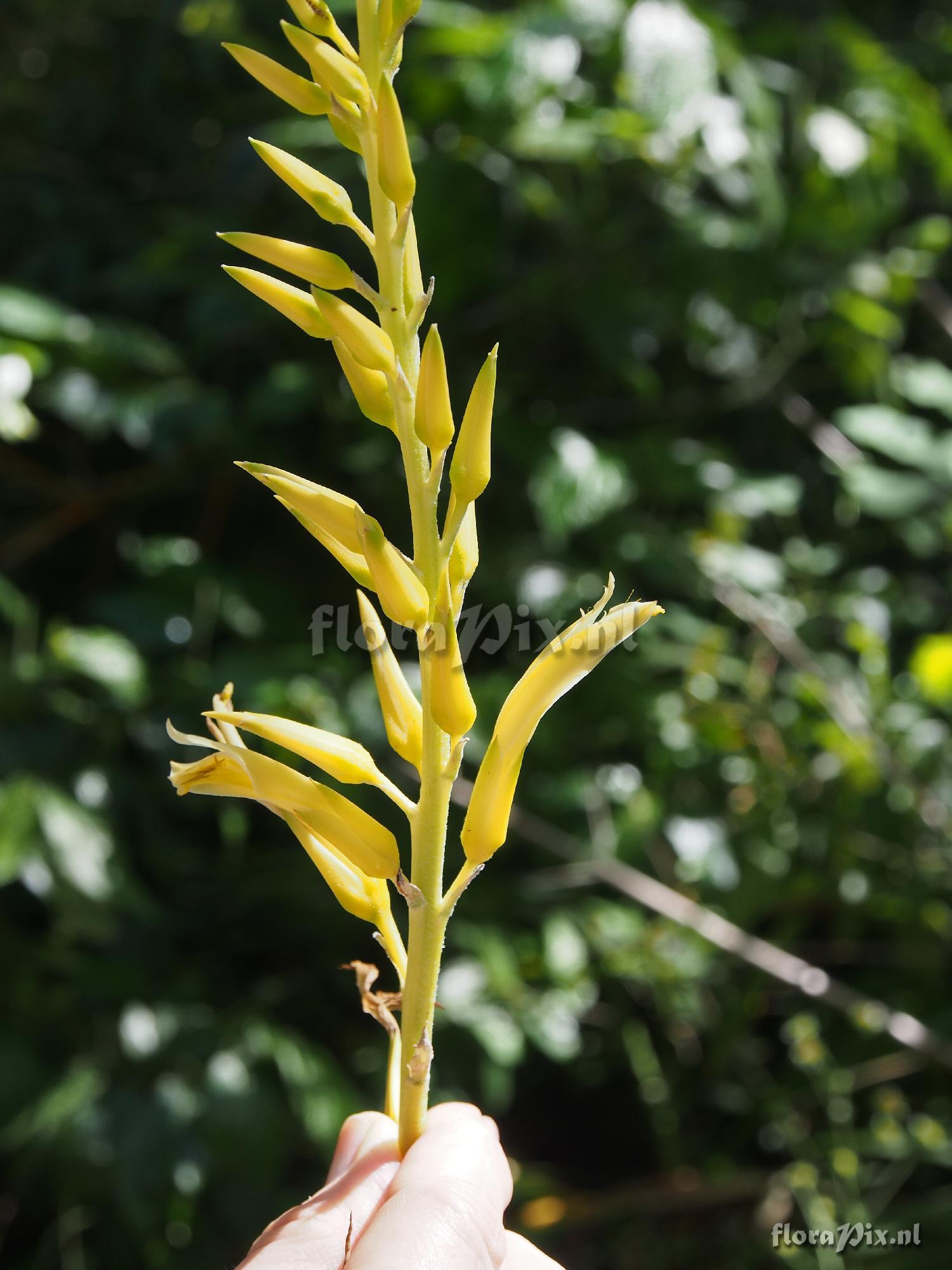 Locality: St Lucia - Top of road leading to Enbas Saut Rainforest Trail in Edmunds Forest Reserve, St Lucia at approximately 770m (2600 ft). Growing terrestrially in a great mass on the road cut. Only one specimen in bloom at the time I was there 2 Feb 2015. Wet, rainforest area and very windy where it was growing. I collected seed from plants nearby. Note that some of the pictures may show white on the flowers, but this is simply glare from off the plant in full sun. All flowers and stems were yellow in color. Plant flowering about 1.2m tall. Note: Pitcairnia angustifolia was seen growing at lower elevations on drier slopes, but it is red in color. Photographer: Jerry Raack Identification: asked