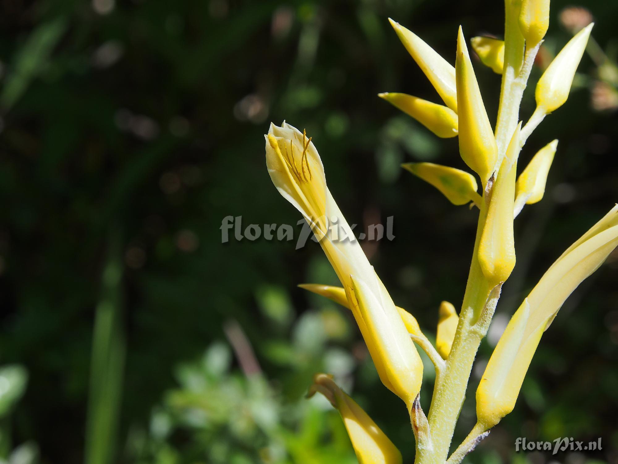 Locality: St Lucia - Top of road leading to Enbas Saut Rainforest Trail in Edmunds Forest Reserve, St Lucia at approximately 770m (2600 ft). Growing terrestrially in a great mass on the road cut. Only one specimen in bloom at the time I was there 2 Feb 2015. Wet, rainforest area and very windy where it was growing. I collected seed from plants nearby. Note that some of the pictures may show white on the flowers, but this is simply glare from off the plant in full sun. All flowers and stems were yellow in color. Plant flowering about 1.2m tall. Note: Pitcairnia angustifolia was seen growing at lower elevations on drier slopes, but it is red in color. Photographer: Jerry Raack Identification: asked
