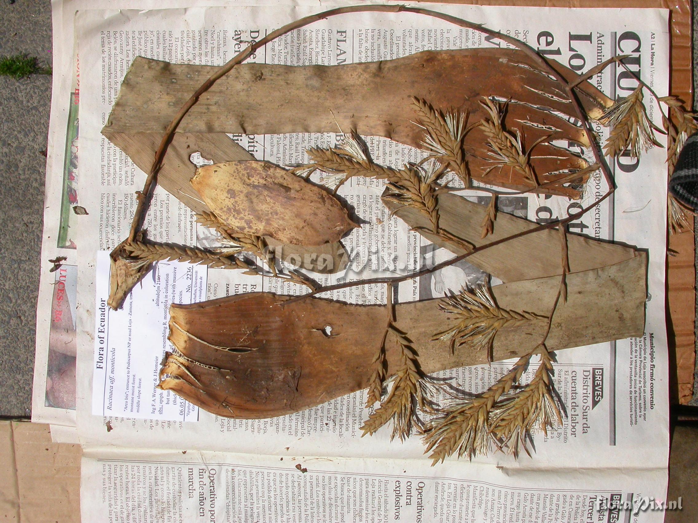 Locality: Ecuador - Arco Iris; entrance to Podocarpus NP or road Loja - Zamora; trail towards river; montane moist forest. Photographer: Florian Werner Note: Col.: Werner, F.A. 2236 (06-05-2007) - Det.: H. Luther (SEL) 2008 "leaves resembling R. monticola in coloration but tank lower, more open, of fewer and longer leaves (with massive (thick) base; infl. semi-pendant, ca. 1m long; rare species. Luther: R. tenuispica (Andre) M.A.Spencer & L.B.Sm.; Till (2011): spiculosa var. spiculosa (Griseb.) M.A. Spencer & L.B. Sm."