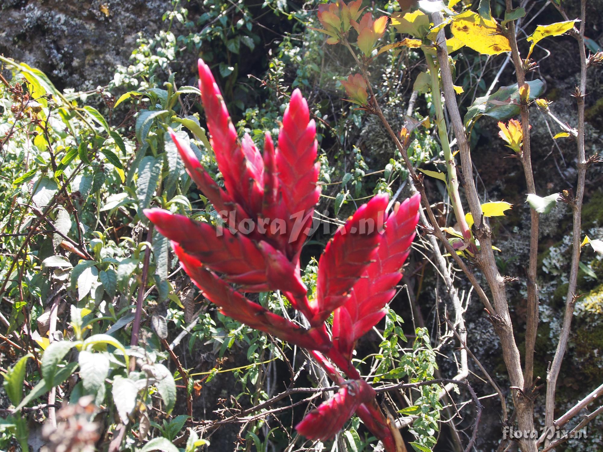 (Uploaded as: Tillandsia ) Locality: Peru - Cajamarca - Found at Cumbe Mayo (about 12 miles southwest of Catamayo) growing at 3300 meters on rock outcroppings in a fairly dry area. Plant about 60 cm tall at flowering. Photographer: Jerry Raack Note: Sorry this is out of focus. Best shot I have of the inflorescence. Identification: solved