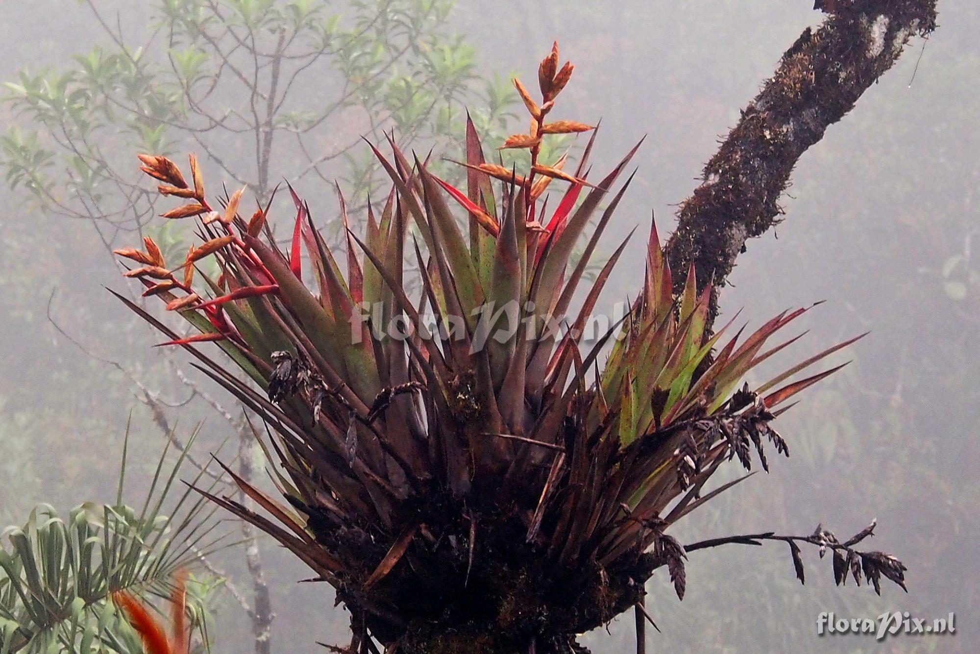 (Uploaded as: Aechmea confinis var caudata?) Locality: Ecuador, Loja Province - Photographed on Route 682 south of Loja in or near Podocarpus Park. Growing epiphytically high in trees along the road and in the forest. Elevation: 2516 meters. Photographer: Jerry Raack Note: I was unable to get close to any of these clumps to take closeup photos. However, based off the photos and the description I read in the Encylopedia of Bromeliads I think this may be Aechmea confinis var caudata based on the very long lower primary bracts, and the rest of the description which basically fits T. confinis. These were fairly large plants growing to about 70 or 80 cm high. (Sent: brom-l@science.uu.nl) Identification: solved