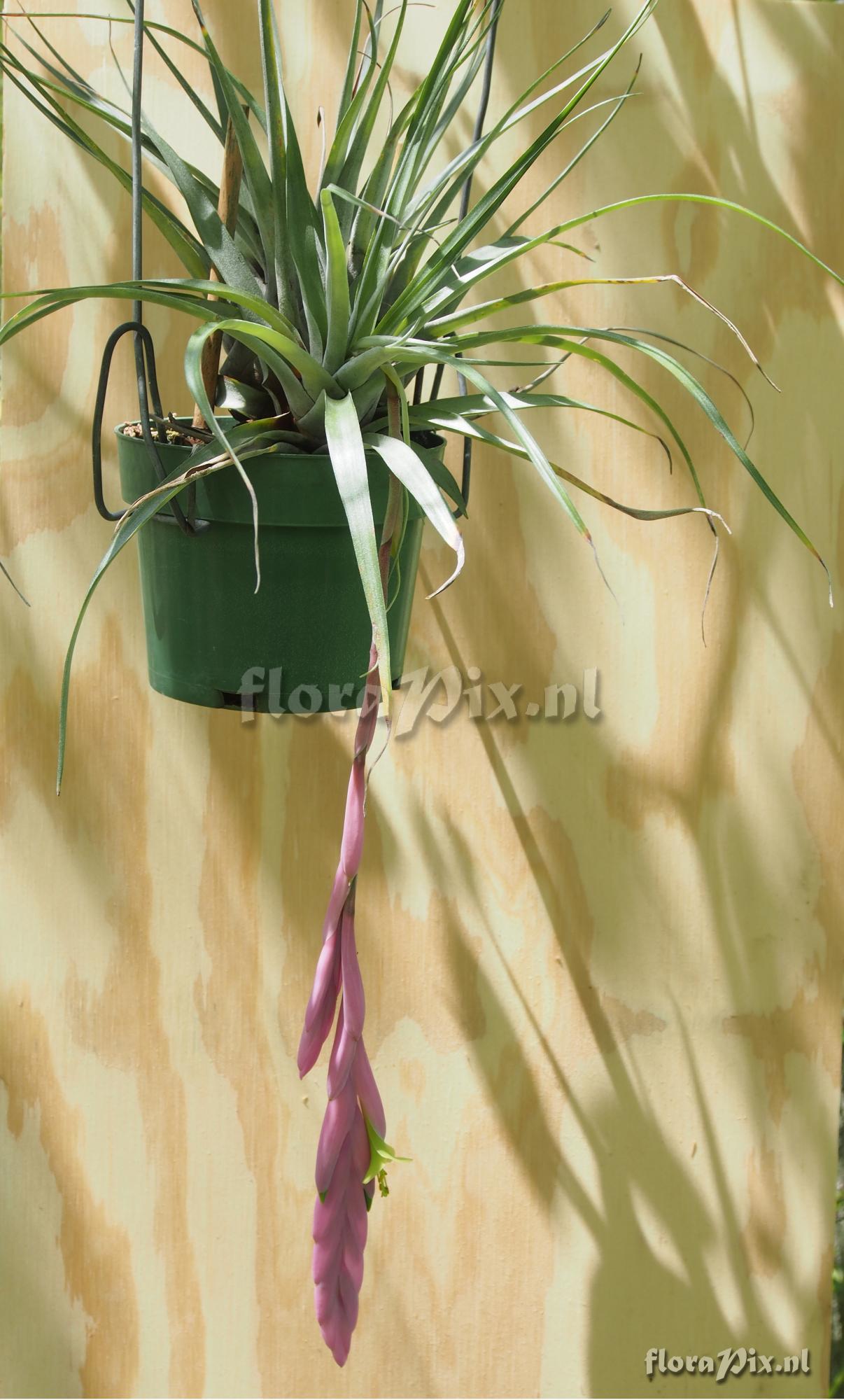 Locality: Ecuador - Unknown - Obtained from Gilberto Merino of Cuenca in 2016 Photographer: Jerry Raack Note: Plant 30 cm wide x 20 cm high (leaves), pendulous inflorescence once-branched hanging 40 cm. Central hanging spike is 20 cm long, one branch is 9 cm long 2.2 cm wide. 4 flowers on branch, 10 flowers on central spike. Leaves 20 cm long; sheath nearly round when flattened, spoon shaped, 6 cm long, 4 cm wide, top brown lepidote, bottom brown heavily lepidote. Blades narrowly triangular, lightly lepidote above, heavily lepidote beneath. Sepals 3 cm long, much shorter than the 6 cm x 1.8 cm floral bracts. Petals 5.5 cm long, a very beautiful green color flaring widely open. Both pistil and stamens exceeding the flower. Yellow pollen, green anther and pistil. I noted in the description of T. penduliscapa in the bromeliad encyclopedia that it is supposed to always have a simple inflorescence, yet my specimen which has bloomed twice for me has always been once branched. Is this possible if it is Tillandsia penduliscapa, or is this some other species? (Sent: brom-l@science.uu.nl) Identification: pending