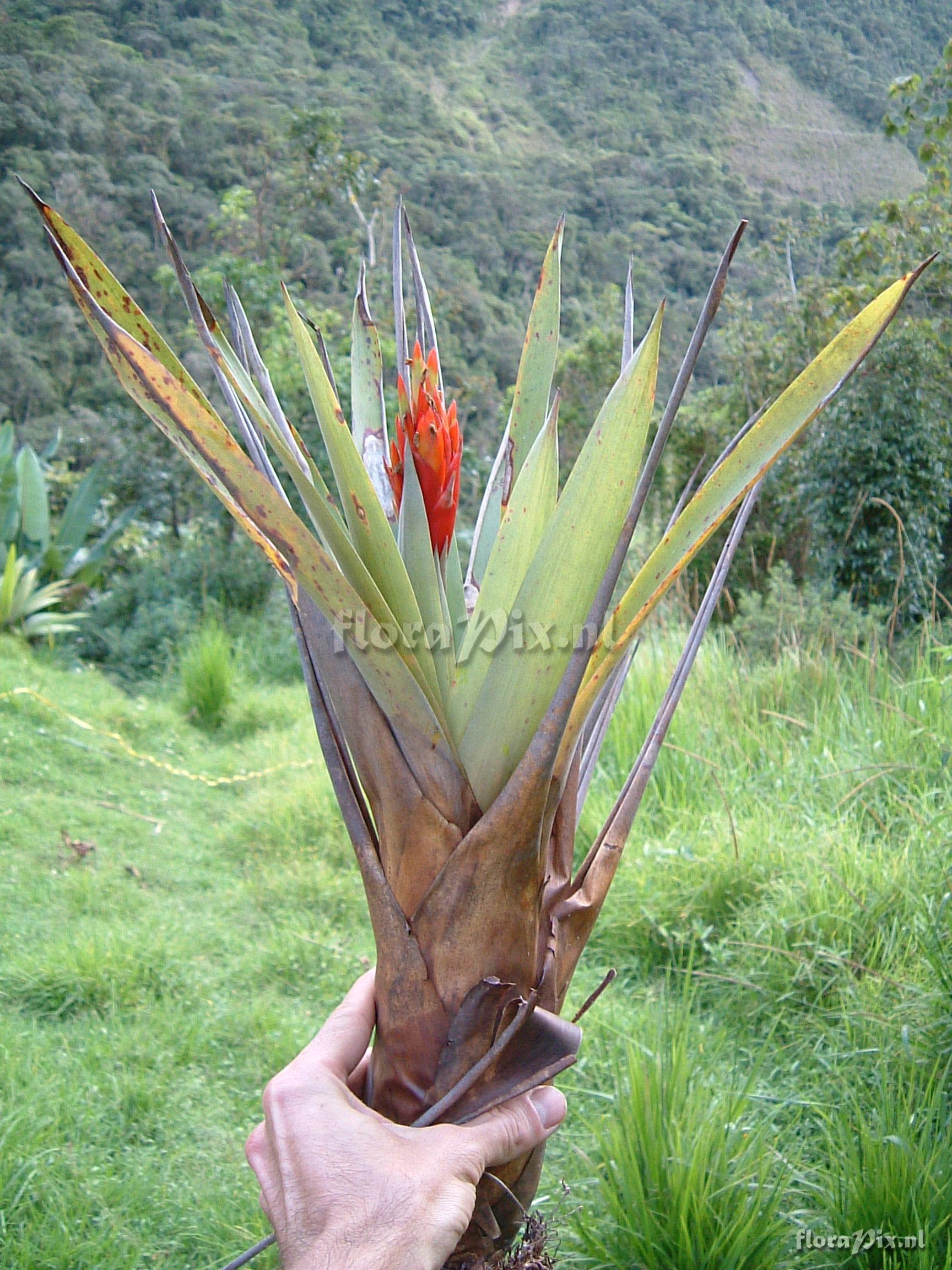 Locality: Ecuador - Prov. of Zamora-Chinchipe, area of Estación Cientifica San Francisco (S 03°58´, W 79°04´ ), road Loja-Zamora, ca. 35 km from Loja; moist montane forest Photographer: Florian Werner Note: Col.: Werner, F.A. 1807 (05-10-2005) - Det.: H. Luther (SEL) 2007 bracts brick-red, corolla whitish (mild) purple. Doesn#t seem to open a lot..