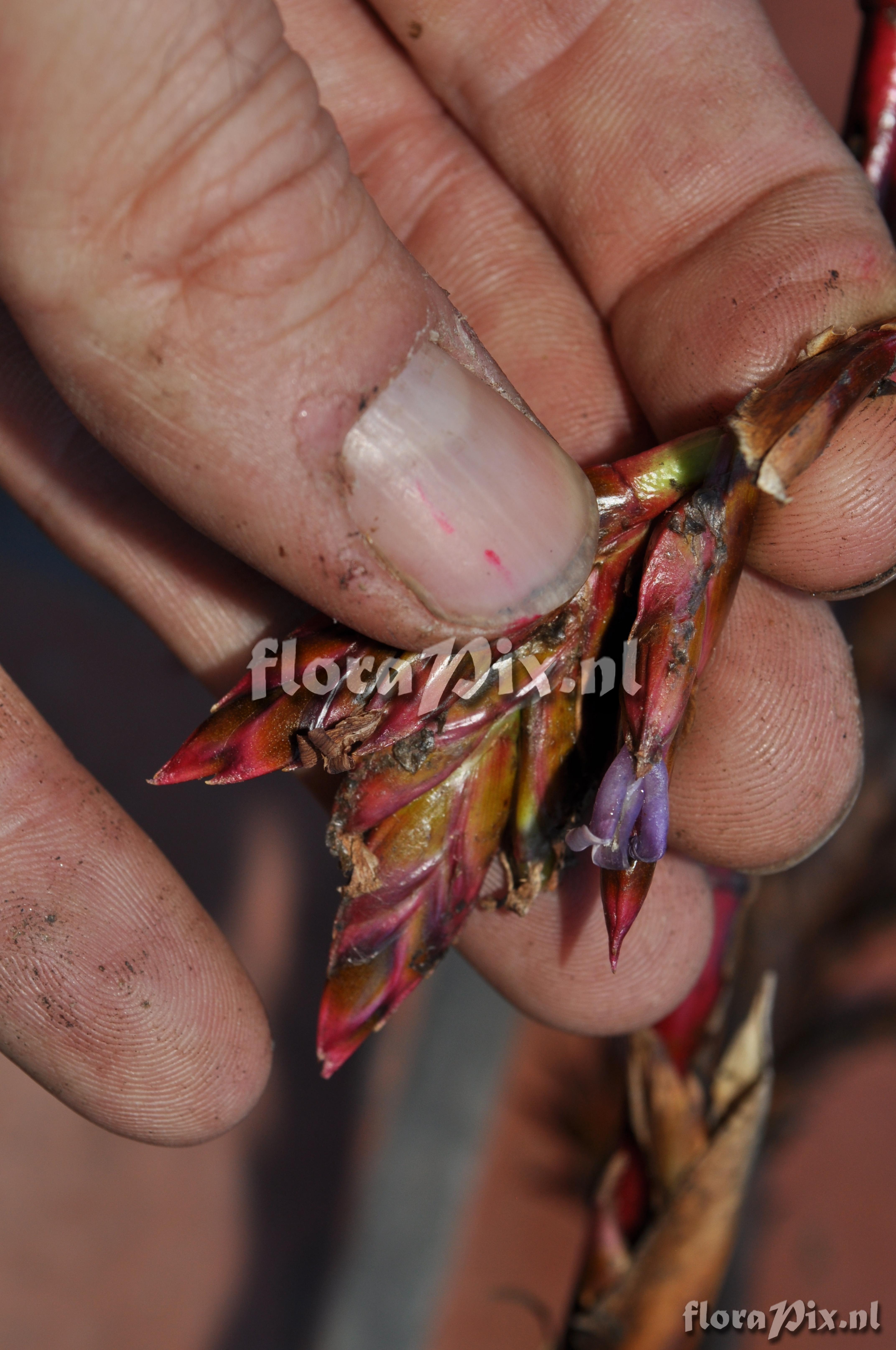 Locality: Ecuador - Prov. of Zamora-Chinchipe, area of Estación Cientifica San Francisco (S 03°58´, W 79°04´ ), road Loja-Zamora, ca. 35 km from Loja; moist montane forest Photographer: Florian Werner Note: Col.: Werner, F.A. 3125 (09-04-2011) "common; strictly terrestrial; high water storage capacity regarding shortness of (the many) leaves; leaf tips rolled up; infl. erect, red, ca. 1-1.3m tall (petals purple); Young plants routinely developing on old fruits eventually drop off and regularly just keep growing. Hatts off."