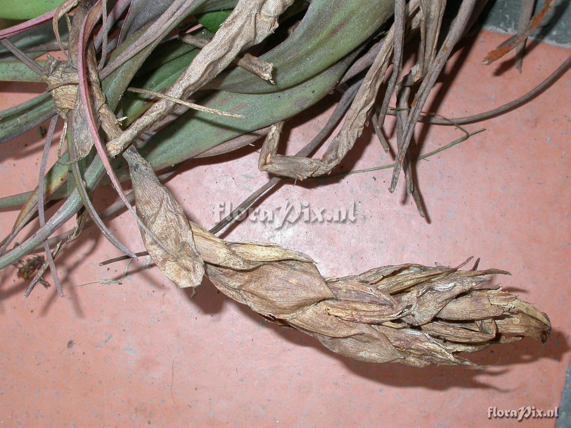 Locality: Ecuador - Prov. of Zamora-Chinchipe, area of Estación Cientifica San Francisco (S 03°58“, W 79°04“ ), road Loja-Zamora, ca. 35 km from Loja; moist montane forest Photographer: Florian Werner Note: (as Werner, F.A. 1962 ) - Det.: H. Luther (SEL) 2007 "greyish type; infl. pending: bracts bright light orange, petals apple-green. Leaves full of trichomes which adaxially in the basal (""tank"")-half are hairy and brown.; strong fibres in leaves."