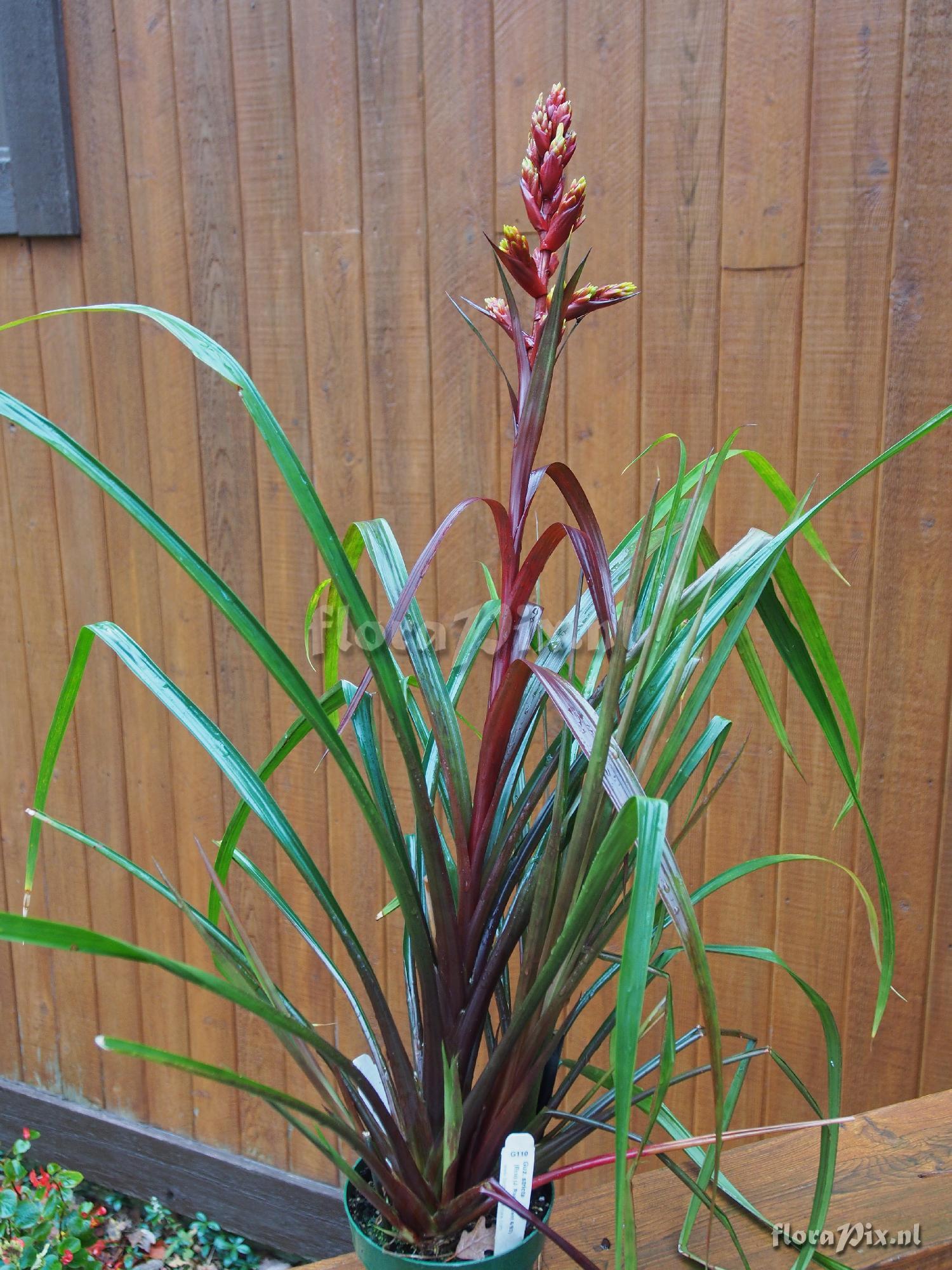 11826 - Bromeliads (Garden) - 2014-10-17(Dimension: 1530 x 2050 pixels - Counter: 18380) Guzmania stricta ![]() Locality: Ecuador - Unknown - Photographer: Jerry Raack Note: Obtained from Jeffery Kent in 1992. Flowering now in my greenhouse. 69cm tall (top of inflorescence) X 51cm wide. Leaves 81cm long X 1.9cm wide, reddish color underneath, and slightly ribbed. Flower scape 20cm long from lowest scape bract to top of inflorescence. Scape bracts 3.8cm to 6.3cm long, tapering to a point. Yellow flowers never fully open. Jeffery: do you remember what locality in Ecuador you might have collected this, and what elevation it grows at? (Sent: brom-l@science.uu.nl) Identification: