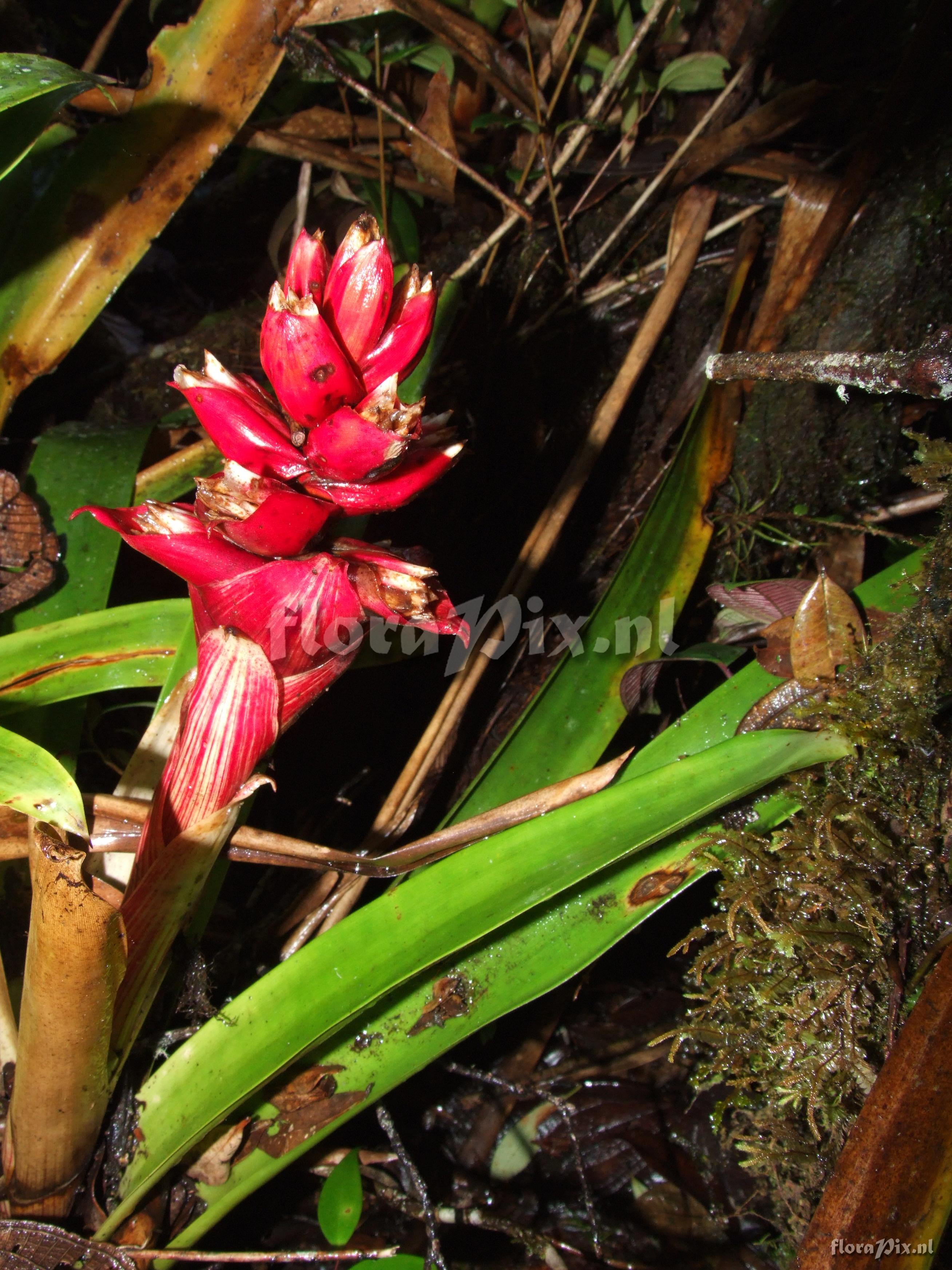 7824 - Bromeliads (Wild) - 2011-10-13(Dimension: 2646 x 3538 pixels - Counter: 8778) Mezobromelia cf. capituligera ![]() Locality: Ecuador - Prov. of Zamora-Chinchipe, area of Estación Cientifica San Francisco (S 03°58“, W 79°04“ ), road Loja-Zamora, ca. 35 km from Loja; moist montane forest Photographer: Florian Werner Note: Col.: Werner, F.A. 2058 (19-06-2006) - Det.: W. Till (U Vienna) 2011 "leaves fairly light green without markings; bracts bright pinkish red; flowering: petals white, slim tubular."