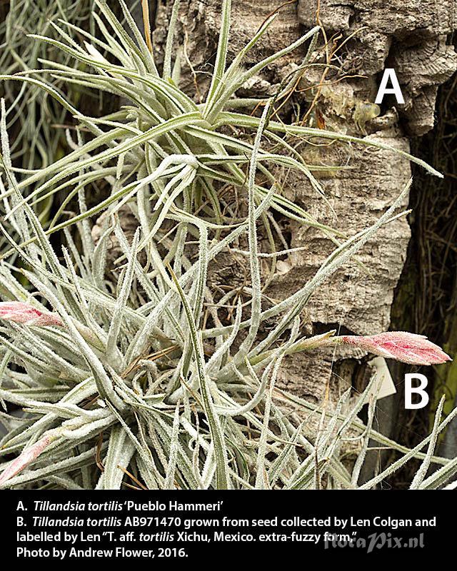 12798 - Bromeliads (Garden) - 2016-09-01(Dimension: 670 x 850 pixels - Counter: 6299) Tillandsia tortilis 'Pueblo Hammeri' ![]() (Uploaded as: Tillandsia tortilis) Locality: New Zealand - Wellington - Anwyl Bromeliads Nursery, Pukerua Bay Photographer: Andrew Flower Note: I don’t think the green effect is due to growing conditions, at least compared to the other T. tortilis AB971470 I have growing here from seed, see new comparative photos – it is a case of a brighter green epidermal layer and less dense leaf scales . Naming this taxon “T. tortilis” is commercially implausible: we have a plant labelled “T. Pueblo x hammeri” that has been in the trade for more than 30 years: now we have decided it is T. tortilis, but I don’t want to start selling it as “T. tortilis” and mislead collectors into buying it thinking it is something new if it is in fact a plant they already have under the old name. So I have registered it in BCR as “Pueblo Hammeri” (pending) so we will sell it as T. tortilis ‘Pueblo Hammeri’ plus a reference to the old name. Note that the T. tortilis AB971470 in the photos is grown from seed collect in Xichu by Len Colgan in 1997 (see caption on attached photo of plants growing side by side). Additional photo of leaves follows. (Sent: brom-l@science.uu.nl) Identification: Solved